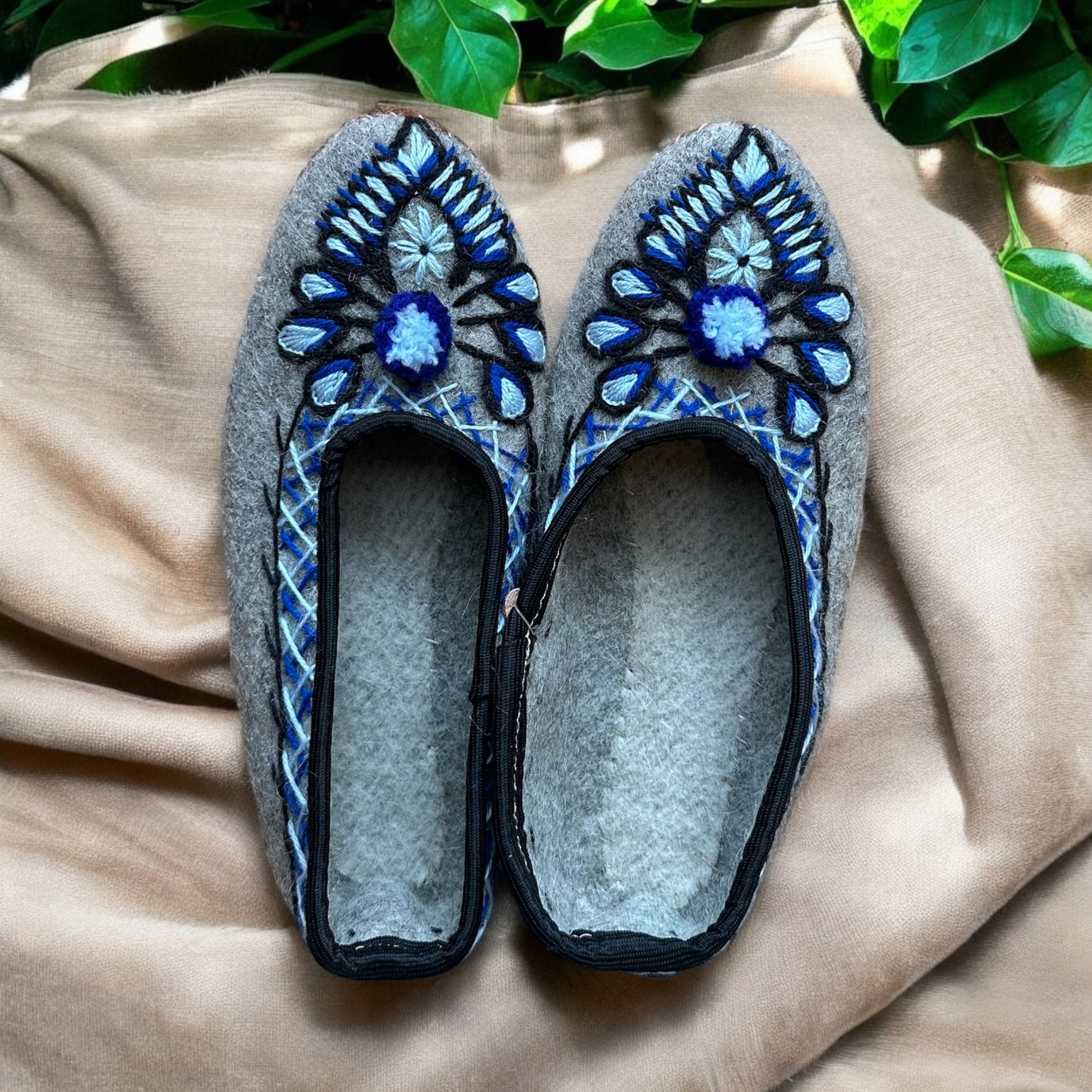 Kapcie z sukna z motywem góralskim, ręcznie haftowane parzenice. Podeszwa skóra naturalna. Ciepłe, wygodne, wytrzymałe.
