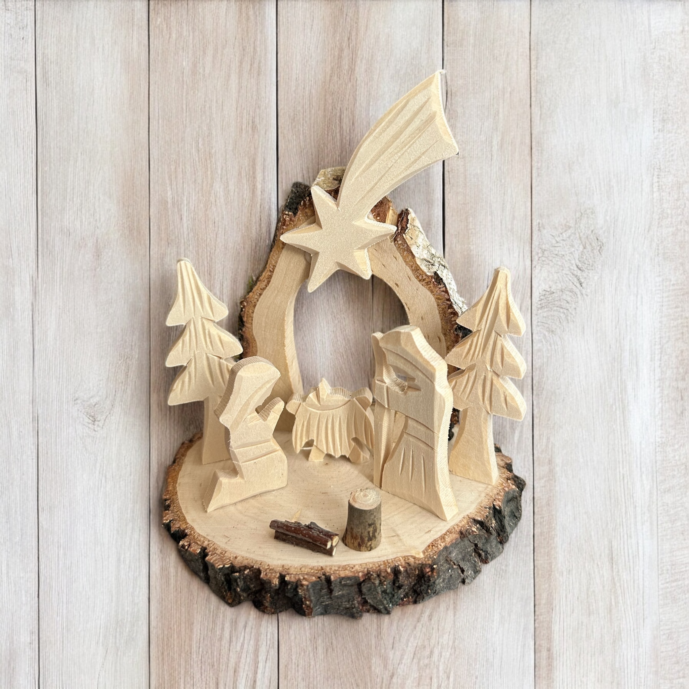 Ręcznie rzeźbiona szopka na plastrze brzozy